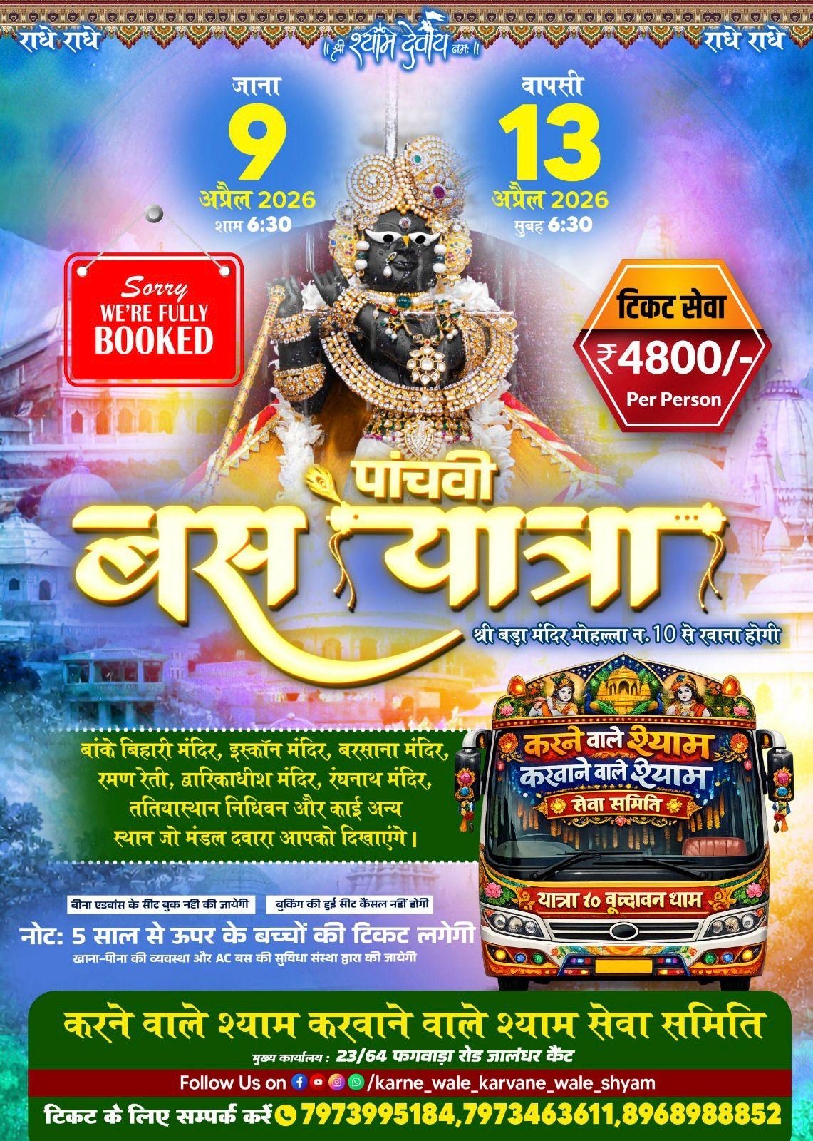 करने वाले श्याम करवाने वाले श्याम सेवा समिति की ओर से वृन्दावन धाम के लिए यात्रा 9 अप्रैल को