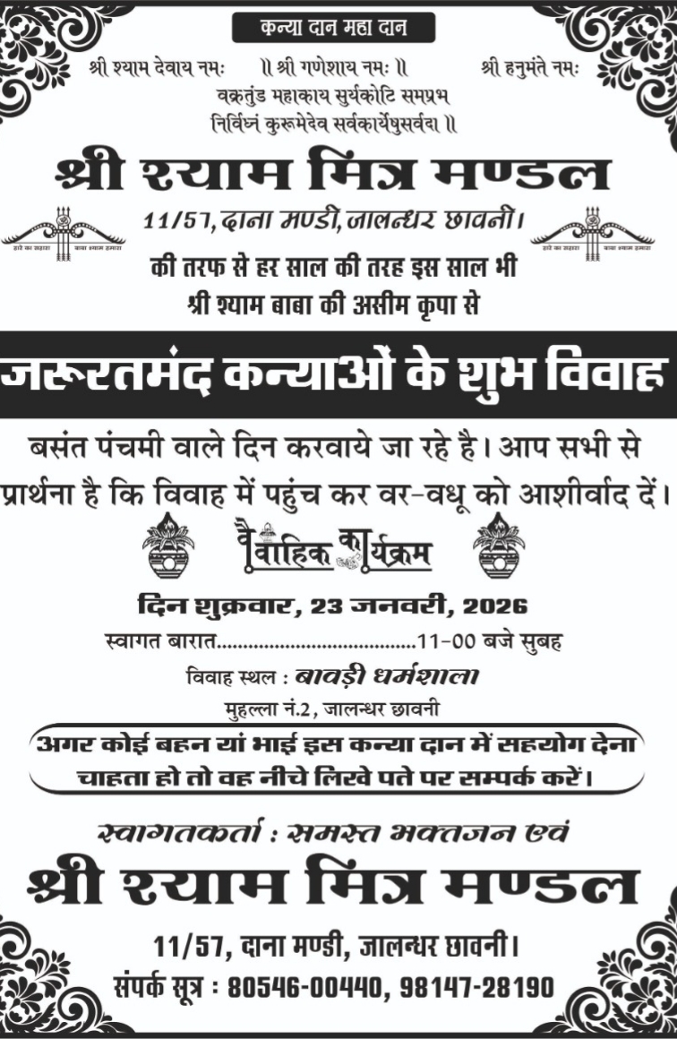 जालंधर छावनी (राहुल अग्रवाल) :- समाज सेवा के क्षेत्र में निरंतर सक्रिय संस्था ‘श्री श्याम मित्र मण्डल’ द्वारा इस वर्ष भी अपनी गौरवशाली परंपरा को निभाते हुए जरूरतमंद कन्याओं के सामूहिक विवाह का आयोजन किया जा रहा है। यह पवित्र कार्य आगामी शुक्रवार, 23 जनवरी 2026 को बसंत पंचमी के शुभ अवसर पर संपन्न होगा। श्री श्याम बाबा की असीम कृपा से आयोजित इस वैवाहिक महोत्सव की शुरुआत सुबह 11:00 बजे बारात के स्वागत के साथ होगी। संस्था द्वारा विवाह की सभी रस्में और सामूहिक भोज बावड़ी धर्मशाला, मोहल्ला नं. 2, जालंधर छावनी में आयोजित किया जाएगा। संस्था के पदाधिकारियों ने बताया कि ‘कन्या दान – महा दान’ के इस संकल्प के तहत हर साल की तरह इस बार भी सामूहिक विवाह करवाए जा रहे हैं। उन्होंने जालंधर और आसपास के समस्त प्रबुद्ध नागरिकों एवं भक्तजनों से अपील की है कि वे भारी संख्या में इस कार्यक्रम में पधारकर नव-विवाहित जोड़ों को अपना आशीर्वाद प्रदान करें। संस्था ने यह भी जानकारी दी कि यदि कोई भी दानवीर भाई या बहन इस नेक कार्य में अपना सहयोग देना चाहता है, तो वे संस्था के मुख्य कार्यालय 11/57, दाना मण्डी, जालंधर छावनी पर संपर्क कर सकते हैं। प्रधान कपिल अग्रवाल, गगन गुप्ता, पुनीत गोयल, राज,कुमार, जगमोहन वर्मा, भोलानाथ ,युवराज,प्रवीण गर्ग, कुमार गौरव,अश्विनी सिंगला ,संभवी सिंगला,वरुण ठाकुर, अमित सिंगला,विधांशु गुप्ता,भास्कर, कृष।